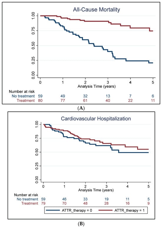 The following supporting information can be downloaded at https://www.mdpi.com/article/10.3390/jcm13185490/s1. Figure S1: Baseline and 1-year follow-up systolic and diastolic blood pressure for patients treated and untreated with tafamidis disease-modifying therapy. Observations: baseline (n = 67 for tafamidis, n = 41 for non-tafamidis) and 1-year follow-up (n = 51 for tafamidis, n = 18 for non-tafamidis); Table S1: Unadjusted hazard ratios from univariable survival analysis for tafamidis-treated patients. No median imputation performed; Table S2: Unadjusted hazard ratios from univariable survival analysis for untreated patients. No median imputation performed; Table S3: Adjusted hazard ratios from multivariable model after performing median imputation for selected continuous variables with miss-ing observations for tafamidis-treated patients; and Table S4: Adjusted hazard ratios from multivariable model after performing median imputation for selected continuous variables with miss-ing observations for untreated patients.