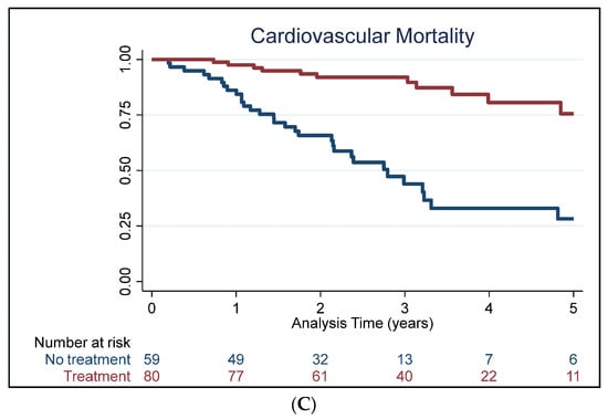 The mean follow-up was 2.9 ± 1.8 years. Over the duration of the study, there were a total of 57 deaths, of which 49 were cardiovascular-related (Table 2). Patients in the tafamidis-treated group were less likely to experience all-cause and cardiovascular mortality overall compared to those untreated (both p < 0.05). Mortality exceeded 50% among the untreated patients. The number of cardiovascular hospitalizations experienced in the cohort did not significantly differ by treatment status. Notably, the median survival time for experiencing all-cause and cardiovascular mortality in patients not on therapy was 2.4 and 2.8 years, respectively, whereas those receiving treatment had a median survival time of 8.2 years (Figure 1). Supplementary Figure S1 presents baseline and 1-year follow-up blood pressure values for patients treated and untreated with tafamidis.