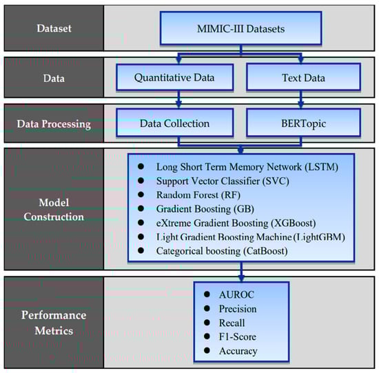 This study collected both quantitative and text data from hospitalized patients. Quantitative data primarily consisted of vital sign data observed within 24 h prior to ICU discharge and basic patient information collected during hospitalization. The collected data underwent data filtering and preprocessing. Text data were derived from patient discharge summaries and analyzed using BERTopic technology to generate themes. To model readmissions of ICU patients within 30 days of discharge, this study employed six commonly used machine learning methods, integrating quantitative and text data predictions. Finally, the models’ predictive performance was evaluated using five different metrics. The research framework is illustrated in Figure 1.
