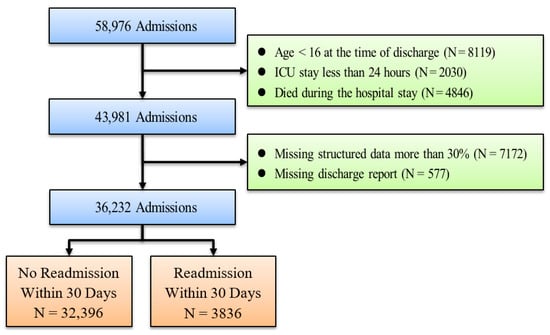 To ensure that our results were comparable to those of previous related studies, we followed the same principles of patient selection and did not analyze the specific disease of the patients. Instead, we used data from all patients in our analysis, which increased the generalizability of our findings. This approach allowed us to contribute to the existing literature on predicting ICU readmission rates while maintaining consistency with previous studies [36,37,38]. The aim of this study was to predict ICU readmission within 30 days of ICU discharge. First, we excluded patients who were younger than 16 years of age at discharge (N = 8119), second, patients who had an ICU stay of less than 24 h (N = 2030), and finally, patients who died during hospitalization (N = 4846) were also excluded. Therefore, we obtained data on 43,981 patients who met the screening criteria.