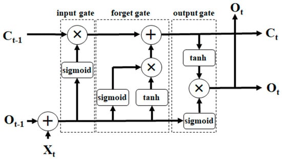 The LSTM network is a powerful type of RNN that excels in capturing long-term dependencies in data. First proposed by Hochreiter and Schmidhuber in 1997, LSTM has found widespread applications in various domains [46]. Unlike conventional RNN neurons that rely solely on the previous hidden state and current input to generate new hidden states, LSTM neurons integrate cell states from multiple past time steps to update their own cell states. As memory cells, LSTM neurons can store their own cell states along with other relevant information. A typical LSTM storage unit, as shown in Figure 4, consists of three key components or gates: (1) the Forget Gate, which decides whether to replace the current cell state with the latest data, based on its output value; (2) the Input Gate, which learns how to store or update data in the appropriate cell state, taking into account various inputs, including the previous time step output (Ot−1), current input (Xt), and the previous time step cell state (Ct−1); and (3) the Output Gate, which plays a crucial role in determining the data to pass to the next node in the network by considering the input and cell state, thereby facilitating the flow of information through the LSTM network. In Figure 4, the “+” and “×” symbols represent key operations within the LSTM unit. The addition operation updates the cell state by combining information from the forget gate and input gate. The element-wise multiplication is employed by the forget gate to determine how much of the previous cell state should be retained, and by the output gate to control how much of the cell state is passed to the next hidden state. These operations are essential for regulating the flow of information through the network and ensuring the effective updating and propagation of cell states across time steps.