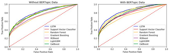 Figure 5 shows that LSTM with the BERTopic data can further improve prediction accuracy. Our findings demonstrate that a model developed by integrating quantitative and text data from ICU patients can accurately predict post-discharge readmission rates. Furthermore, our models using both quantitative and text data generally outperform models using only quantitative data. BERTopic-LSTM is the best models for predicting ICU patient readmission rates. The AUROC is a single measure used to summarize the overall performance of the model, with a value of 1.0 representing a perfect classifier and 0.5 denoting a model that performs no better than random guessing. In Figure 5, the red dashed line represents the performance of a random classifier, serving as the baseline with an AUROC of 0.5. In our study, the ROC curves for each classifier, including those enhanced with BERTopic data, illustrate the improvement in discriminative ability brought about by integrating textual data from patient discharge summaries. This visual representation helps clarify how well the model can distinguish between patients who will be readmitted within 30 days and those who will not, thereby supporting more effective clinical decision-making, as shown by the data in Figure 5. The model achieves an AUROC of 0.7994. Our study highlights the value of basic patient observation and judgment during hospitalization, which significantly affects the accuracy of model predictions. By taking text data as input, higher-level concepts not present in physiological data can be accessed. Overall, our results suggest that integrating quantitative and text data from hospital ICU patients can accurately predict post-discharge readmission rates.