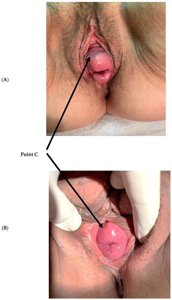 Apical pelvic organ prolapse. (A) Point C at + 2.5 cm; (B) point C at +0.5 cm.