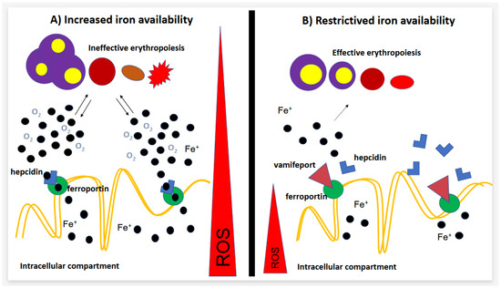 Under physiological conditions, during stress erythropoiesis, anemia causes increased erythropoietin (EPO) secretion by the kidneys. EPO stimulates ERFE secretion, by erythroblast cells, thus inhibiting hepcidin transcription. When the hepcidin level is reduced, an increase in the uptake of iron is physiologically described, because of the upregulated ferroportin’s degradation, as well as a release of recycled iron from macrophages, resulting in adequate iron accessibility for erythropoiesis and a suitable compensatory erythropoiesis [10].