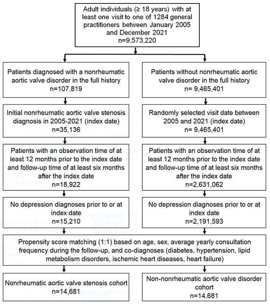 This study included patients aged ≥18 years with a diagnosis of non-rheumatic aortic valve stenosis (AS, ICD-10: I35.0, I35.2) in 1284 general practices in Germany between January 2005 and December 2021 (index date; see Figure 1). The first documented diagnosis of AS in this time period was considered as the index date. Further inclusion criteria included an observation time of at least 12 months prior to the index date and a follow-up time of at least six months after the index date. Patients with a diagnosis of depression prior to or at the index date were excluded.