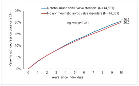 Cumulative incidence of depression in individuals with and without aortic valve stenosis.