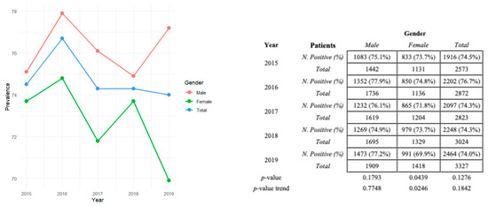 Among the 10,927 positive patients screened in 2015–2019, the distribution of gender in each year was investigated. A total of 6409 (58.7%) males tested positive for the HAV total immunoassay, with respect to the 4518 positive females (41.3%) (Table 3). From the provided description, it emerges that, for each year, the number of positive males is greater than the female population, implying the greater susceptibility of men to the disease. This statistically significant association between sex and positivity to HAV screening is confirmed by the chi-squared test p-value of less than 0.05.