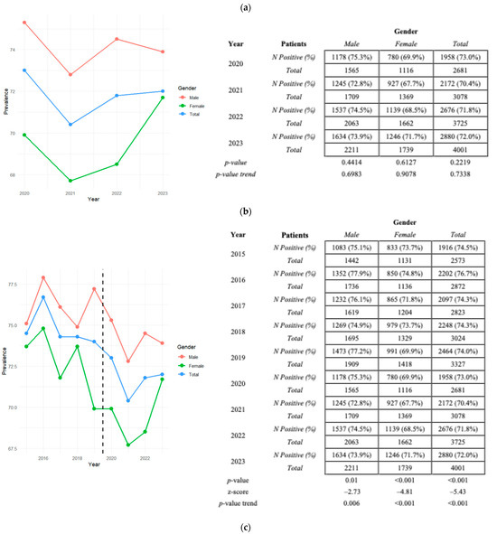 Graphical representation of HAV seropositivity prevalence stratified for the male and female genders and total (male + female + total) in (a) 2015–2019, (b) 2020–2023, and (c) 2015–2023. The relative p-value and p-value trends in the (a) pre-pandemic and (b) pandemic periods are also reported. Z-scores in (c) represent the trend direction.