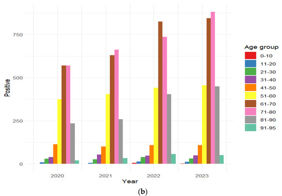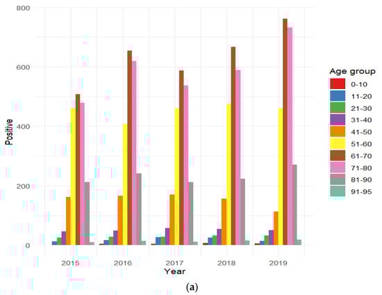 A stratification of the total positive samples by age group and by gender was performed. As reported in Table 5, the age groups investigated were individuals aged 0–10, 11–20, 21–20, 31–40, 41–50, 51–60, 61–70, 81–90, and 90–95 years. Although the number of total positives may fluctuate over the years, the age distribution of positive cases seems to remain constant from year to year, with a large increase from the 41–50-year-old class to the 51–60-year-old class. Furthermore, a decrease is recorded, probably due to the lack of survival of the patients in the transition to the 81–90-year-old class.