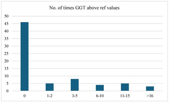 Figure 1 highlights the frequency distribution of the number of times gamma-glutamyl transferase (GGT) levels were above the reference values. This distribution indicated that most patients (64.8%) maintained GGT levels within the reference range. A small proportion of patients experienced elevated GGT levels, with the highest frequency (11.3%) being 3–5 times above the reference range. Statistical analysis indicated that there was no significant association between the frequency of GGT levels being above the reference values and the clinical form (moderate or severe), based on the Pearson chi-square test (