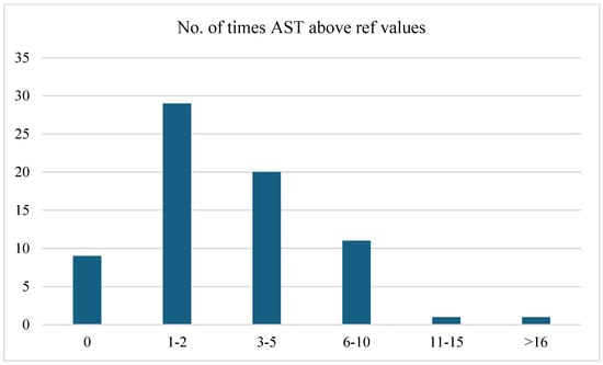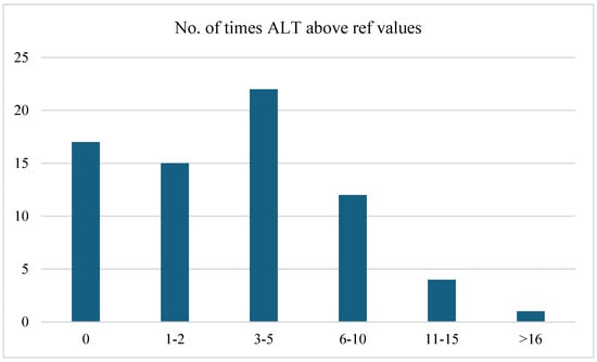 Figure 3 highlights the frequency distribution of the number of times alanine aminotransferase (ALT) levels were above the reference values. This distribution indicated that a significant proportion of patients (31.0%) experienced ALT elevations 3–5 times higher than the reference values. Nearly a quarter of the patients maintained their ALT levels within the reference range, whereas another quarter experienced elevations 1–2 times above the reference values. Fewer patients had more frequent elevations, with 16.9% experiencing levels 6–10 times above the reference values and smaller percentages exceeding this range. Statistical analysis indicated that there was no significant association between the frequency of ALT levels being above the reference values and the clinical form (moderate or severe), based on the Pearson chi-square test (