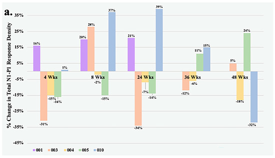 (a) Percentage change from baseline in the total N1-P1 response density and (b) changes from baseline in BCVA at each visit of all study eyes. Subject 001 was unable to undergo testing at Weeks 36 and 48. Subjects 003 and 004 both received rescue aflibercept treatments at Weeks 24 and 36.