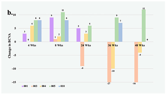 In addition to treatment administration, a follow-up evaluation was performed at Weeks 4, 8, 24, 36, and 48 to assess safety, tolerability, BCVA changes, and physiological changes. The Early Treatment Diabetic Retinopathy Study (ETDRS) approximation, letters = 85 − (50 × logarithm of the minimum angle of resolution), was utilized to calculate BCVA, and the same type of VA measurement at each visit was ensured for consistency [8]. Slit lamp examination, intraocular pressure measurement, OCT, and fundus photography assessed anatomical changes and safety profiles during the study period.