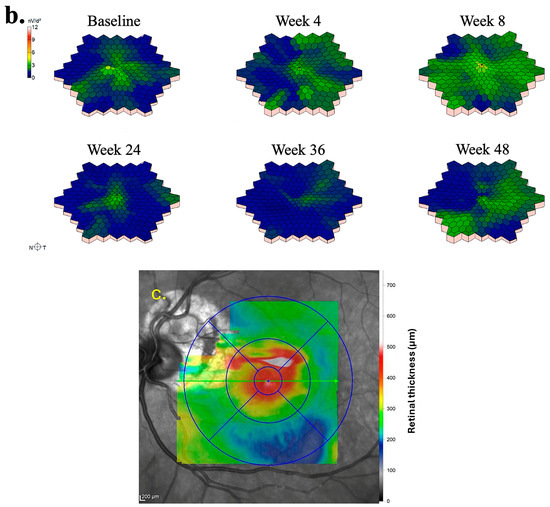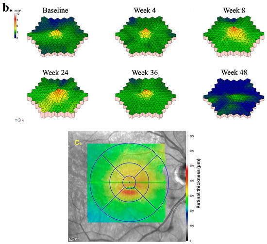 The mfERG findings pertaining to the left eye of Subject 003 are summarized in Figure 3. Temporal regions of individual hexagon responses revealed both improvements and regressions at Week 4 with moderate noise in rings 1 and 2, attributable to persistent central edema (Figure 3a). At Week 8, numerous regions exhibited improvement, including the superior and inferior macular. As mentioned previously, this subject experienced severe cystic edema following Week 8, necessitating the usage of rescue aflibercept treatments at Weeks 24 and 36. Accordingly, responses at Week 24 declined in similar regions to those that improved at Week 8. By Week 36, the cystic edema became more widespread, leading to predominantly low waveforms. Following rescue treatments, superior and inferior mfERG responses rebounded as the edema improved, becoming primarily localized to foveal regions at Week 48. Three-dimensional topographies demonstrated a similar trend to trace arrays with improved responses up to Week 8, as well as severely regressed topographies at Weeks 24 and 36 (Figure 3b). At baseline, the foveal and parafoveal regions exhibited the most significant edema, which consistently correlated with noise throughout subsequent visits (Figure 3c).