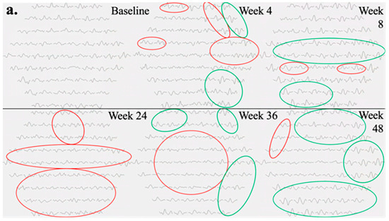 Within the foselutoclax-treated cohort, three of five subjects demonstrated a BCVA of ≥5 ETDRS letters over baseline at Weeks 4, 8, and 24, which is equivalent to a single line of visual acuity. Mean change in BCVA demonstrated statistical significance at Weeks 4 and 8, showing increases of 5 (p = 0.02) and 6.2 (p = 0.02) ETDRS letters, respectively (Table 2). Additionally, two of five subjects achieved a BCVA gain of ≥5 ETDRS letters over baseline at Weeks 36 and 48. A strong correlation between N1-P1 response density and BCVA was observed in some subjects, best exemplified by Subject 001 (r = 0.81) and Subject 010 (r = 0.64). However, visual improvements did not consistently align with correlated total N1-P1 response density increases, as evidenced by Subject 003 (r = 0.15) and Subject 004 (r = −0.05). It should be noted that Subjects 003 and 004 required rescue treatments of aflibercept at Weeks 24 and 36 due to increased edema, which was associated with both decreased BCVA and total N1-P1 response density.