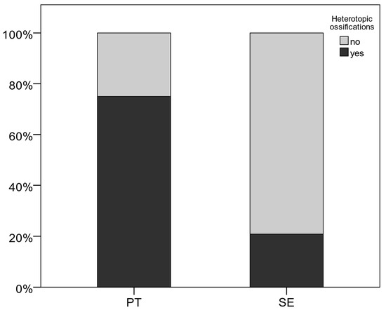 There are even hints of gender-specific differences in the expression of heterotopic ossifications after central nervous system trauma. Ranganathan et al. showed that male mice formed ~30% more ectopic bone when compared to female mice, possibly due to increased insulin-like growth factor-1 and bone morphogenetic protein (BMP) signaling in males [36]. Unfortunately, due to there being only one female patient in the PT group, gender-specific evaluations were not possible.