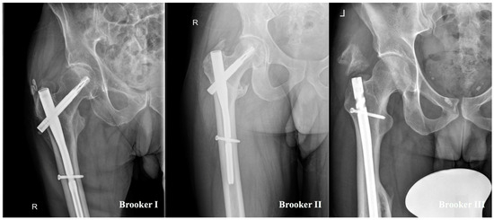 Figure 2 demonstrates the different stages of the Brooker classification in a standardized hip X-ray in the present study. In the polytrauma group, Brooker stage I and II were documented in four (33.3%) patients each, and stage III in only one (8.3%) patient. In the single-extremity cohort, Brooker stage I was documented three (12.5%) times and stage II two (8.3%) times. Brooker stage IV was not observed in the present study.