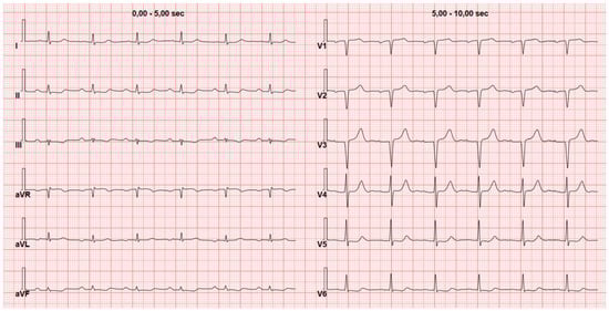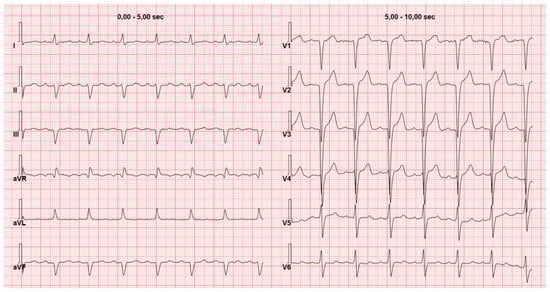 A second red flag for CA on ECG is low QRS voltage (Figure 2). This phenomenon is observed in in 25–90% of CA patients with a great variability among different studies and is more frequent in AL amyloidosis compared to other types of CA [12,13,14,15]. Another potential factor contributing to the diverse prevalence of low voltages in CA is the heterogeneous definition of “low voltages”. A study has demonstrated that the prevalence of low voltages can vary within the same patient population when different criteria are used, such as a Sokolow–Lyon index of ≤15 mV, low voltages in peripheral leads (≤5 mV in each peripheral lead), or low voltages across all leads (QRS ≤5 mV in each peripheral lead and ≤10 mV in each precordial lead) [16]. Among these, the Sokolow–Lyon index is the less commonly used criteria showing low voltages in around 60% of patients with AL or ATTR in a study with 200 CA patients by Cyrille et al. [17] On the other hand, with the same criteria, a low variability of low voltage prevalence has been described ranging from 11% to 82% of patients [16,18,19,20]. It has been observed that factors influencing QRS voltages in the general population, such as left ventricular (LV) mass index, age, gender, hypertension, body surface area, and smoking habits, do not predict voltage amplitude in patients with cardiac amyloidosis (CA). This lack of correlation can be explained by the infiltration of amyloid. Indeed, these non-conductive deposits cause LV wall thickening disrupting the relationship between QRS voltages and LV mass. Consequently, the suspicion of CA should arise when there is a discrepancy between LV mass and QRS voltages [21].