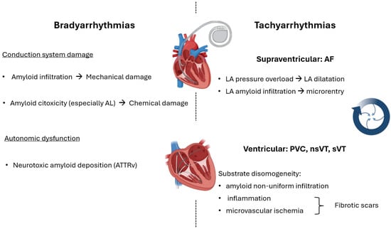 In CA, many factors are involved in AF onset: atrial amyloid infiltration with electrical and mechanical impairment promoting re-entrant circuits [44,45], pressure overload caused by high left ventricular end-diastolic pressure because of ventricular diastolic dysfunction leading to left atrium dilation, ectopic beats, and electrical instability (Figure 3). As for electric abnormalities, prolongation of the AH and HV intervals is observed, along with a heterogeneous reduction of electrical voltages in the left atrium. Indeed, among 7 patients with CA (4 with ATTRwt and 3 with AL) and persistent AF undergoing an electrophysiological study with electroanatomical mapping of the left atrium for arrhythmia ablation, mean voltages per atrial segments explored (measured while on AF) were significantly lower than the same measures performed in patients with persistent AF but without CA [10]. Because of these large abnormalities, non-pulmonary vein triggers for AF are common. In a study with 74 patients undergoing AF ablation for the first time, 51 patients (68.9%) had triggers in the left atrial appendage, coronary sinus, crista terminalis, interatrial septum, or mitral valve annulus [50].