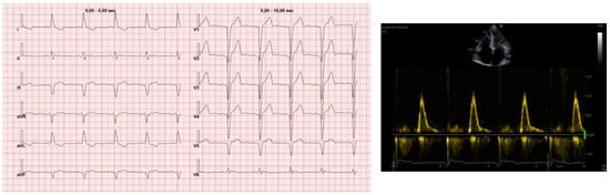 Cardiac amyloidosis (CA) is an emergent cardiomyopathy related to misfolded protein deposition, most commonly transthyretin (transthyretin amyloidosis, ATTR) or light chains (light chain amyloidosis, AL). CA has an important impact on quality of life [1,2] and classically presents with an infiltrative–restrictive pattern, especially affecting diastolic function and causing heart failure with preserved ejection fraction (HFpEF). It is not limited to left ventricle dysfunction and many systemic manifestations have been described [3,4,5]. The electrocardiogram is a simple and cost-effective tool which plays an important role in suspecting CA. Furthermore, patients with CA may also frequently experience different types of arrhythmias: bradyarrhythmias caused by the involvement of the conduction system, such as atrioventricular blocks, and tachyarrhythmias, such as atrial fibrillation or ventricular arrhythmias with potentially serious outcomes. Despite their importance, ECG abnormalities and arrhythmias in CA are still poorly explored.