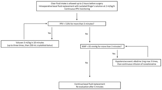 All patients enrolled in the study were allowed to drink clear fluids until two hours before surgery. After general anesthesia induction, the intraoperative basal fluid replacement was achieved in both study groups by continuous infusion of 2 mL/kg/h of Lactate Ringer’s solution, administered through a volumetric infusion pump (Alaris GW, Cardinal Health S.P.A., Milan, Italy).