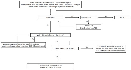 For the near-zero group (control group), urine output was compensated 1:1 during surgery with Lactate Ringer solution, and hemodynamic management was performed according to a pre-established protocol (see Figure 2) to achieve a minimum MAP of 65 mmHg and urinary output higher than 0.5 mL/kg/hr. Interventions included fluid resuscitation with Lactate Ringer solution or colloids (Voluven), administration of vasopressors (etilefrine or noradrenaline), and red blood cells (RBC) transfusion. Crystalloid boluses (Lactate Ringer 250 mL) were allowed up to a total of 1000 mL. Etilefrine boluses of 1 mg were administered up to three times if MAP fell below 65 mmHg. These episodes were documented as hypotensive events and analyzed. If MAP remained below 65 mmHg after three consecutive hypotensive events, a continuous infusion of noradrenaline (0.05–1 mcg/kg/min) was initiated.