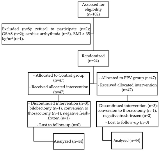One hundred and two patients were considered eligible for this study. Eight patients were excluded for the following reasons: refusal to participate (n = 2); OSAS (n = 2) and cardiac arrhythmia (n = 3), BMI > 35 kg/m2 (n = 1). Ninety-four were randomly assigned to two groups. Six patients were excluded due to conversion from VATS to thoracotomy for technical reasons (n = 2), and when surgery was limited to wedge resection instead of the scheduled lobectomy for the negative fresh-frozen (n = 3) or to bilobectomy (n = 1). Data from 88 patients were finally analyzed (Figure 3).
