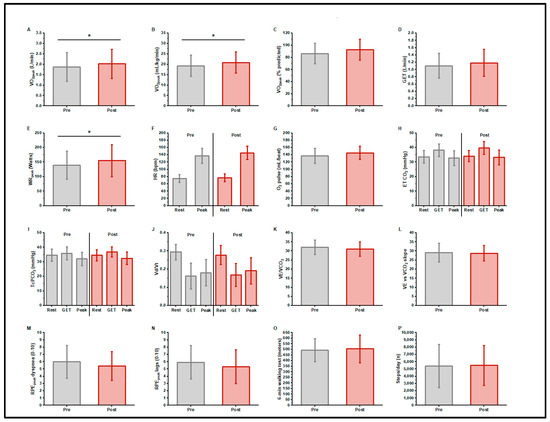 Pre- and post-exercise training ramp CPET results (n = 14). O2, oxygen uptake; LAT, estimated lactic acidosis threshold; for O2 at LAT, the % predicted is 40% of peak O2; VE, minute ventilation; CO2, carbon dioxide output; E to CO2 slope, the slope of the relationship between E and CO2 measured between 20 W and the respiratory compensation point; WR, work rate (watts); MVV, maximum voluntary ventilation estimated from the forced expiratory volume in 1 s * 40; peak HR, maximum HR recorded during the CPET. Peak O2 pulse = peak O2/peak HR. All predicted values from Wasserman et al. [41].