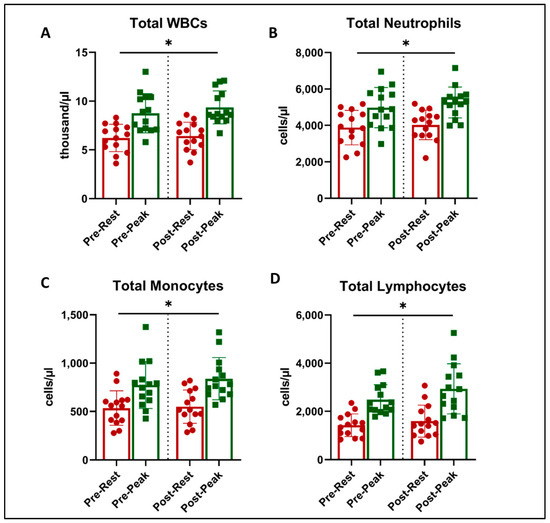 Total leukocyte counts at rest (red) and peak exercise during CPET (green) before and after exercise training in long COVID patients. There was an increase in cell numbers related to acute exercise in total WBC counts (A), total Neutrophils (B), Total Lymphocytes (C), and Total Monocytes (D) (* = all p < 0.001, 2-way ANOVA). There was no effect on this response with exercise training.
