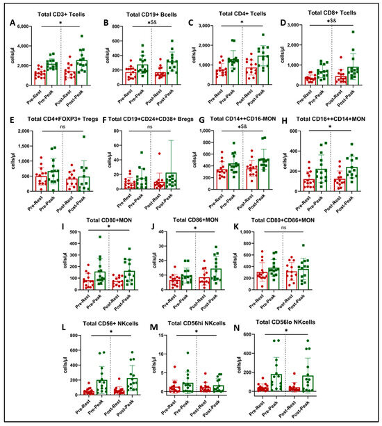 Immune cell subtype counts at rest (red) and at peak exercise during CPET (green) before and after exercise training in long COVID patients. * = main effect of acute exercise (A,C,H,I,J,L,M,N). $ = acute exercise x training interaction (B,D,G). & = p < 0.05 in paired t-test (post-hoc, (B,D,G)). There was no effect of exercise training on immune cell subset counts (ns = not significant, panels E,F,K).