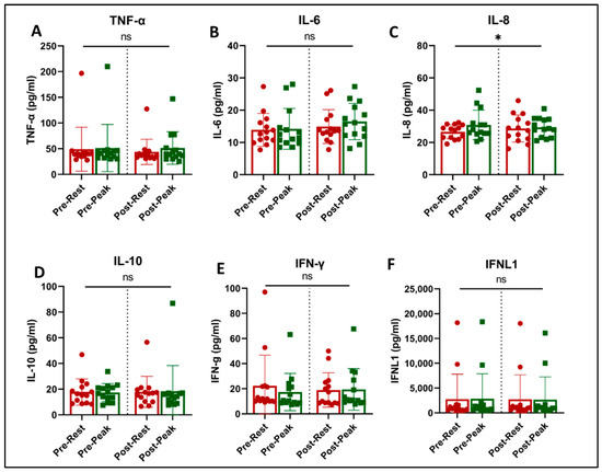 Plasma immune biomarkers at rest (red) and at peak exercise during CPET (green) before and after exercise training in long COVID patients. * = slight increase in IL-8 with acute exercise (p = 0.042, (C)). There was no effect of training on any of the evaluated immune biomarkers. ns = not significant.