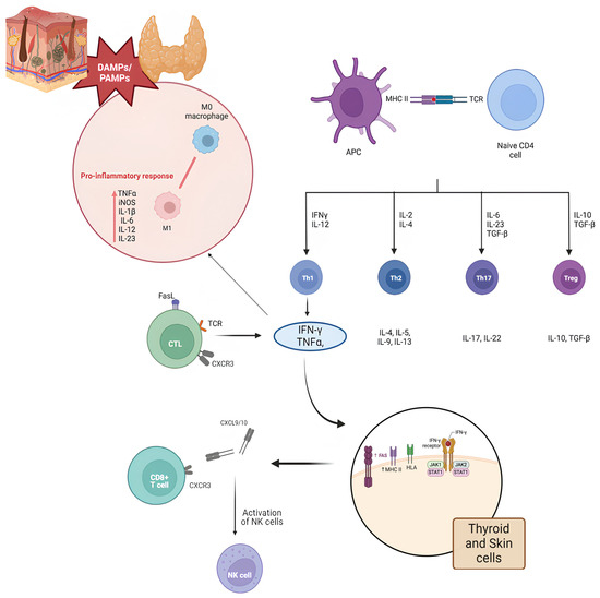 Figure 1 depicts a schematic representation of the potential triggers and cytokine patterns implicated in the pathogenesis of cutaneous and thyroid autoimmune disorders.