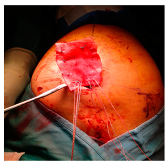 Rotator cuff (RC) tears affect more than 50% of patients older than 60 years and represent the most common cause of debilitating pain and loss of function of the shoulder [1,2]. A wide variety of surgical options are available for treating massive RC tears, ranging from arthroscopic repair to shoulder arthroplasty [1]. However, even if the employment of reverse shoulder prosthetic replacement has become more common, special attention should be given to the younger population. In fact, reverse shoulder prosthesis may lead to impaired range of motion, a potential need for further revisions, and a significant impact on daily life [1,3]. It is therefore preferable to recur for tears repair in younger people, even in the case of massive lesions. It has been recently demonstrated that this surgical option leads to long-term improvements, and results are superior to the baseline also in the case of repair failure [1]. When a complete repair is not feasible, the use of grafts has been suggested to improve the healing potential. Initially described by Neviaser et al. [4] in 1978, several studies have reported that grafts used in massive and irreparable RC tears can improve tissue quality, promoting biological healing and biomechanical integrity of the repaired tendons, and representing today an accepted method for repair of larger RC tears [5,6,7,8]. Graft materials include autografts, allografts, xenografts, and synthetic or hybrid grafts [9,10]. Biological grafts consisting of bioactive and decellularized membranes with properties such as the tendon extracellular matrix may improve cell proliferation and neoangiogenesis in the repair site, while synthetic grafts may have excellent mechanical resistance but little or no biological properties with possible limitation to the growth of new tendinous tissue, triggering inflammatory responses and foreign body reactions [11,12]. According to the morphology of the RC tear, two different reconstruction methods may be employed. When in the presence of a poor-quality tissue but fully repairable tendon, the patch can be sutured on the bursal side of the reinserted RC to provide both mechanical and biological reinforcement to the primary repair (patch augmentation technique) [10,13]. When the RC lesion cannot be repaired without excessive tension (retracted tears, inadequate tendon excursion), the patch can be interposed between the residual tendon and the tuberosity, bridging the gap (patch bridging technique) [10,14].