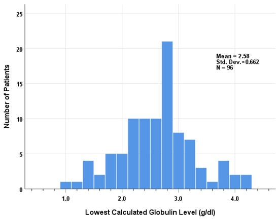 In this patient cohort, the median value of the lowest CG level was 2.65 g/dL (Figure 3). We performed a sensitivity analysis using a different definition of a low CG level by using a median value of the lowest CG level in this study population, which was 2.65 g/dL. By this definition, there were 48 patients with lower CG levels and 48 patients with higher CG levels. Among the patients with the lower CG levels, 29 patients had no infection, 13 had one episode, 4 had two episodes, and 2 had three episodes. Among those with higher CG levels, 42 patients had no infection and 6 had one episode. In univariable analysis, a lower CG level was significantly associated with increased prevalence of infection, with a prevalence ratio of 4.50 (95% CI: 1.86–10.89, p < 0.001). In a multivariable analysis, after accounting for thymectomy, a lower CG level remained independently associated with the increased prevalence of infection, with a prevalence ratio of 4.73 (95% CI: 1.95–11.48, p = 0.001).