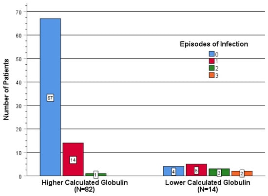 When classifying patients according to the number of infection episodes that had occurred (Figure 2), a higher proportion of patients with higher CG levels experienced no infection compared to those with lower CG levels. Specifically, among patients with higher CG levels (N = 82): 67 had no infection, 14 had one episode of infection, and 1 had two episodes of infection. Among those with lower CG levels (N = 14), 4 had no infection, 5 had one episode of infection, 3 had two episodes of infection, and 2 had 3 episodes of infection.
