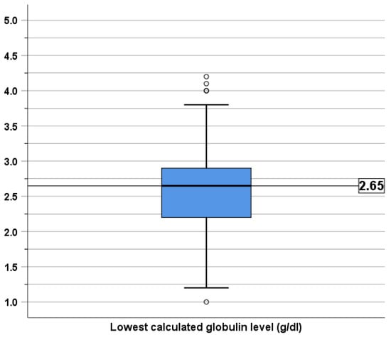 Unfortunately, serum IgG level, a key diagnostic parameter for Good’s syndrome, is not included in routine laboratory tests. Nonetheless, for many patients with TET, serum protein and albumin levels are measured during routine clinical care, thus allowing for the calculation of globulin levels. When the serum albumin level is subtracted from protein, a calculated globulin (CG) level can be readily derived. In some clinical settings, CG can be a useful screening test for hypogammaglobulinemia, which is associated with the risk of an opportunistic infection [,,,]. For example, in populations with primary immunodeficiency, CG levels ranging from 1.8 to 2.4 g/dL have been shown to correlate with hypogammaglobulinemia, a situation where prophylactic IgG replacement therapy is indicated. To our knowledge, however, no study on CG level has been conducted among the TET patient population. In this paper, we investigate the association between CG levels and infections.