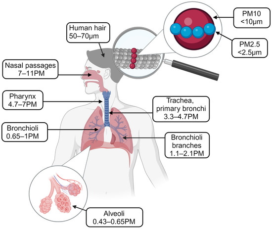Comparison of PMs’ perimeters and areas where PMs penetrate the respiratory system [36]. PM10 is known to penetrate the nasopharynx and start inflammatory reactions in the upper levels of the respiratory tract. PM2.5 appears to have a particularly adverse effect due to its size and ability to travel deep within the respiratory system. PM1 is thought to penetrate the lowest portions of the respiratory system (such as the bronchioli and alveoli), although many details of its nature and mechanisms are still to be explored. [Created with BioRender.com accessed on 6 April 2024. This figure is licensed under BioRender’s Academic License Terms and is intended for use in this publication only. Agreement number: MQ278AXY29].