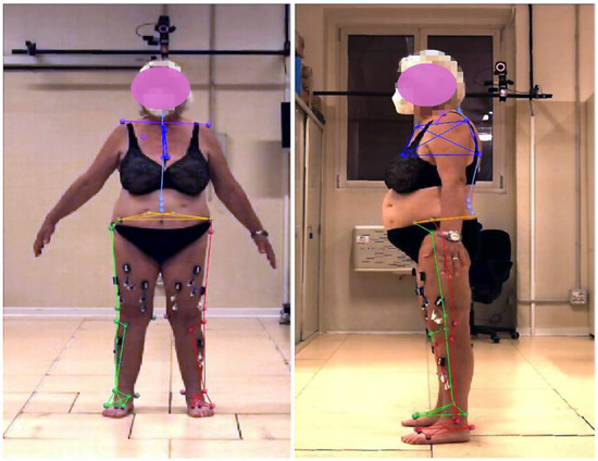 Frontal and lateral pictures of a representative patient during the collection of static pose data. The positions of the markers were used to define the anatomical reference frames [18,19,20]. Specifically for hip, knee, and ankle motion data extraction, pelvis markers were located on the left and right superior anterior–posterior iliac spines; thigh markers were located on the greater trochanter and medial and lateral epicondyles; shank markers were located on the head of the fibula, the tibial tuberosity area, and medial and lateral malleoli; and foot markers were located on the calcaneal insertion of the Achilles tendon, as well as on the first, second, and fifth metatarsal heads.