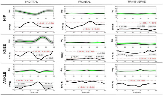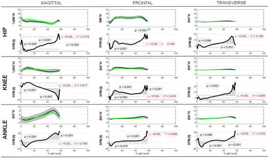 Pre- and post-operative 3D kinematics and kinetics of the hip, knee, and ankle joints from the gait analysis were calculated in degrees (°) and as a % of the patient’s body weight (BW) for height (H) and versus a % of the gait cycle. All data are reported in terms of the mean ± standard deviation. These values were compared with the reference data pertaining to healthy populations. The reference data were obtained from the literature and only pertained to the task of flat walking. Statistical parametric mapping (SPM) was used to assess the presence of statistically significant differences between the post-operative and normal data [22,25]. This technique, originally used to identify the regionally specific effects in neuroimaging data, allows for the analysis of continuous data in space and time and has recently been applied to biomechanical analyses [26]. Pearson’s moment–product correlation coefficient (R) was calculated to determine the relationships between the pre- and post-operative clinical and radiological scores. In all comparisons, a p-value of less than 0.05 was taken to reveal the statistically significant differences; otherwise, non-significance (NS) was indicated. Those performing calculations were blinded to the pre-/post-operative timeframes (Matlab®, R2022a The MathWorks, Inc., Natick, MA, USA).