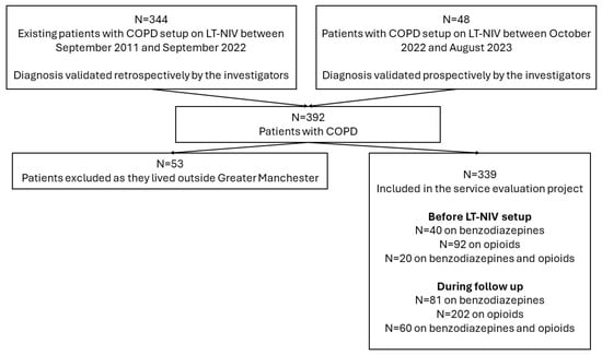 With disease progression, patients with COPD are susceptible to developing hypercapnia []. Hypercapnia in patients with COPD is associated with increased mortality [] and increased susceptibility to chest infections []. In line with this, normalising hypercapnia in COPD using long-term non-invasive ventilation (LT-NIV) improves survival [,,] and reduces the exacerbation rate []. It is unclear, however, how opioids and benzodiazepines affect the effectiveness of LT-NIV in patients with COPD, as patients taking these medications are either excluded in randomised controlled trials, medications are not reported, or their effects are not analysed [,,]. Whilst benzodiazepines could worsen respiratory failure and contribute to adverse events, effective ventilation may counteract this effect, potentially mitigating their risk. To the best of our knowledge, only one retrospective study has investigated these medications in patients with COPD on LT-NIV, which showed that opioid and benzodiazepine use was associated with decreased survival. However, this study did not analyse these medications separately, and neither were exacerbations studied [].