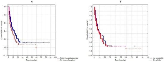 Exacerbation-free survival when patients on and off benzodiazepines (A) as well as on and off opioids (B) were compared.