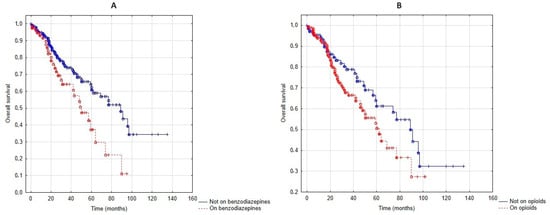 Overall survival when patients on and off benzodiazepines (A) as well as on and off opioids (B) were compared.