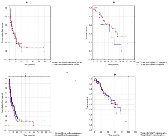 Analysing the 81 patients who took benzodiazepines, the additional use of opioids did not affect exacerbation-free survival (p = 0.97, Figure 4A) or overall survival (p = 0.68, Figure 4B). In contrast, in those 202 patients who took opioids, the addition of benzodiazepines tended to decrease exacerbation-free survival (p = 0.09, Figure 4C), but did not significantly affect overall survival (p = 0.44, Figure 4D).