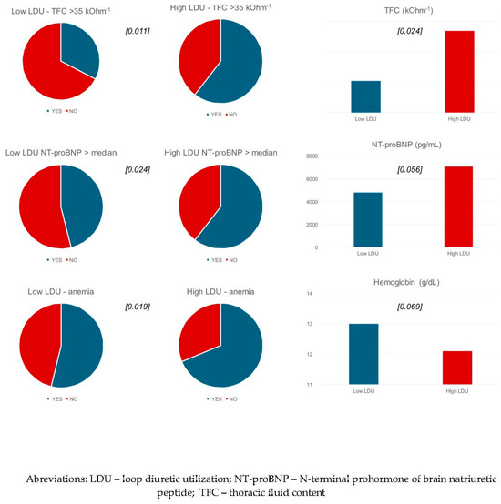 The full course of i.v. diuretic dosing during hospitalization was documented for 97 patients, 49 of whom required high-LDU and 48 who required low-LDU treatment. Compared to low-LDU patients, high-LDU patients had higher TFC at admission, both quantitatively (37.4 ± 8.1 vs. 34.1 ± 6.9 kOhm-1; p = 0.024) and qualitatively (TFC ≥ 35 kOhm-1: 59.2% vs. 33.3%; p = 0.011). Furthermore, in the high-LDU group, anemia was more common (67.4% vs. 43.8%; p = 0.019), as was qualitatively elevated NT-proBNP (≥median of 3952 pg/mL: 60.4% vs. 37.5%; p = 0.024) (Table 2, Figure 1). No significant differences were observed in age; gender; NYHA class; symptoms; comorbidities (including diabetes, hypertension, and atrial fibrillation); pre-admission treatment, including diuretics, LVEF, HR, CI, BP, and SVRI; or chest X-ray changes. The high-LDU group was associated with significantly longer hospital stays (12.9 ± 6.4 vs. 7.0 ± 2.6 days; p < 0.001) (Table 2).