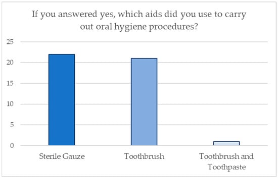 With respect to maneuvers of oral hygiene, 32 participants claimed to have introduced this practice in their newborn’s first months of life, whereas 68 did not. The parents’ preferred aids for performing oral hygiene procedures are shown in Figure 2.