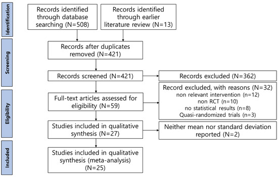 Initially, 421 duplicate studies were removed. The titles and abstracts of the remaining studies were then screened according to the inclusion and exclusion criteria, resulting in 59 studies being preliminarily selected. However, among these, 12 studies were excluded due to inappropriate interventions, such as comparing the effectiveness of EMDR with other interventions (ex., CBT and exposure therapy), using combined methods that included EMDR and the emotional freedom technique, or combining EMDR with pharmacotherapy. Additionally, 10 studies were excluded for not utilizing a randomized experimental design, 8 studies were excluded for not providing calculable statistical results, 3 studies were excluded for being quasi-experiments, and 2 studies were excluded because, despite providing effect sizes, it was not possible to extract the means and standard deviations for each group before and after the intervention. Ultimately, 25 studies were selected for inclusion in the final analysis (Figure 1).