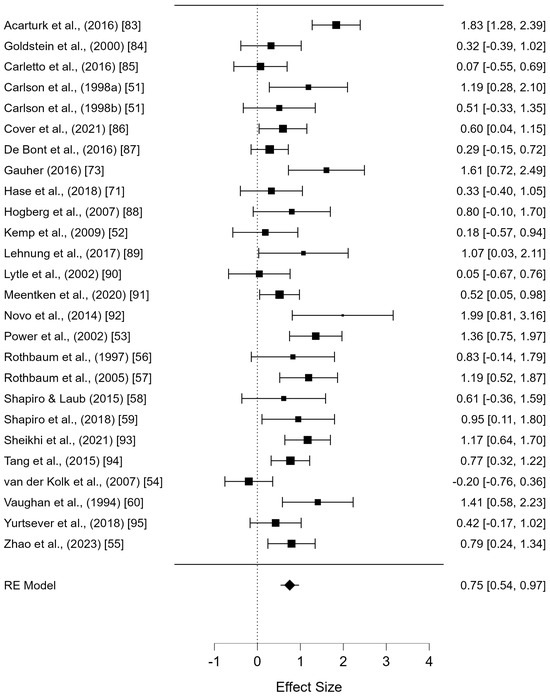 Previous studies on PTSD have reported that EMDR interventions improve comorbid depression [46,52,57,64,67]. When treating PTSD with EMDR, comorbid depression showed significant improvement. EMDR has been shown to be more effective than a waitlist control [46,52,57,58,59,60,61,65,67], no treatment [64], and even more effective than pharmacotherapy with antidepressants (e.g., fluoxetine) [64]. Additionally, EMDR has been reported to have effects similar to exposure therapy [59,76,77,78]. Other studies have also found that when compared to cognitive behavioral therapy (CBT), EMDR has a similar effect on improving comorbid depression, with no significant differences between the two interventions [57,79,80].