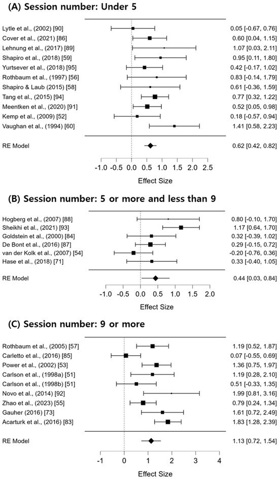 For the clinical application of EMDR, a subgroup analysis was conducted by categorizing the number of EMDR sessions into three groups: 5 or fewer sessions, 6–10 sessions, and more than 11 sessions. The results of this analysis are presented in Figure 3. The average effect size for each subgroup was statistically significant. Specifically, the effect size for 5 or fewer sessions was Hedges’ g = 0.62 (95% CI: 0.42–0.82; I2 = 0%; Q = 9.78; df = 10; p = 0.46); for 6–10 sessions, Hedges’ g = 0.44 (95% CI: 0.03–0.84; I2 = 62.56%; Q = 13.65; df = 5; p = 0.018); and for more than 11 sessions, Hedges’ g = 1.13 (95% CI: 0.72–1.54; I2 = 66.22%; Q = 24.54; df = 8; p = 0.002). The effect size was the largest for interventions with more than 11 sessions, though the heterogeneity remained moderate to high.