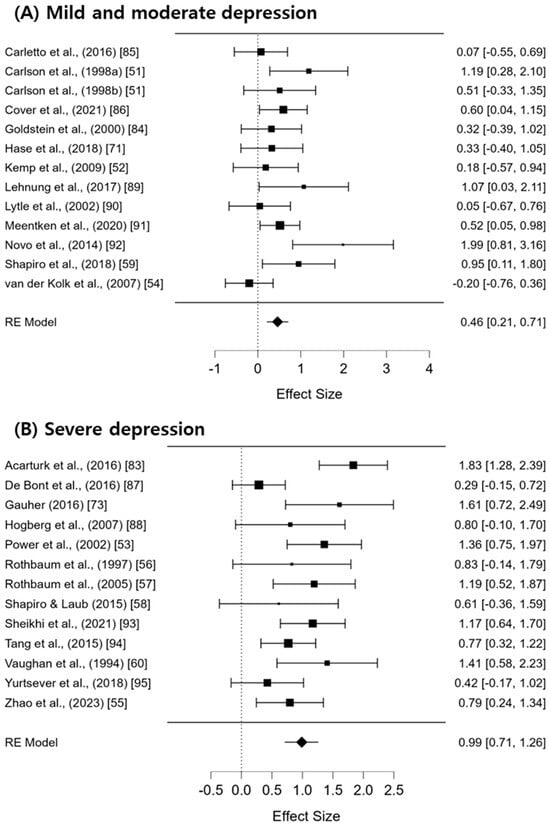 To examine the differences in EMDR effectiveness according to the severity of depression, a subgroup analysis was conducted by categorizing depression symptoms into mild and moderate-to-severe levels (Figure 4). For the group with mild depression, the effect size was Hedges’ g = 0.46 (95% CI: 0.21–0.71), indicating a moderate effect size with low heterogeneity (I2 = 35.85%; Q = 20.74; df = 12; p = 0.054). In the group with moderate-to-severe depression, the effect size was Hedges’ g = 0.99 (95% CI: 0.71–1.26), indicating a large effect size, with heterogeneity remaining moderate to high (I2 = 57.99%; Q = 29.36; df = 12; p < 0.05).