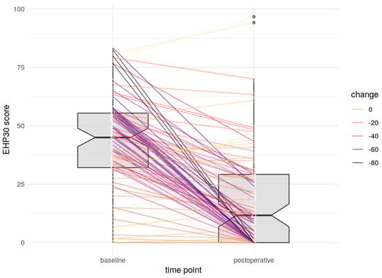 Finally, the postoperative EHP-30 score was multivariately analyzed via ordinal logistic regression. p-values < 0.05 were considered statistically significant. Additionally, the change from baseline was plotted as a boxplot, with dots representing each patient and lines showing the actual change (with colors representing the magnitude of the change).
